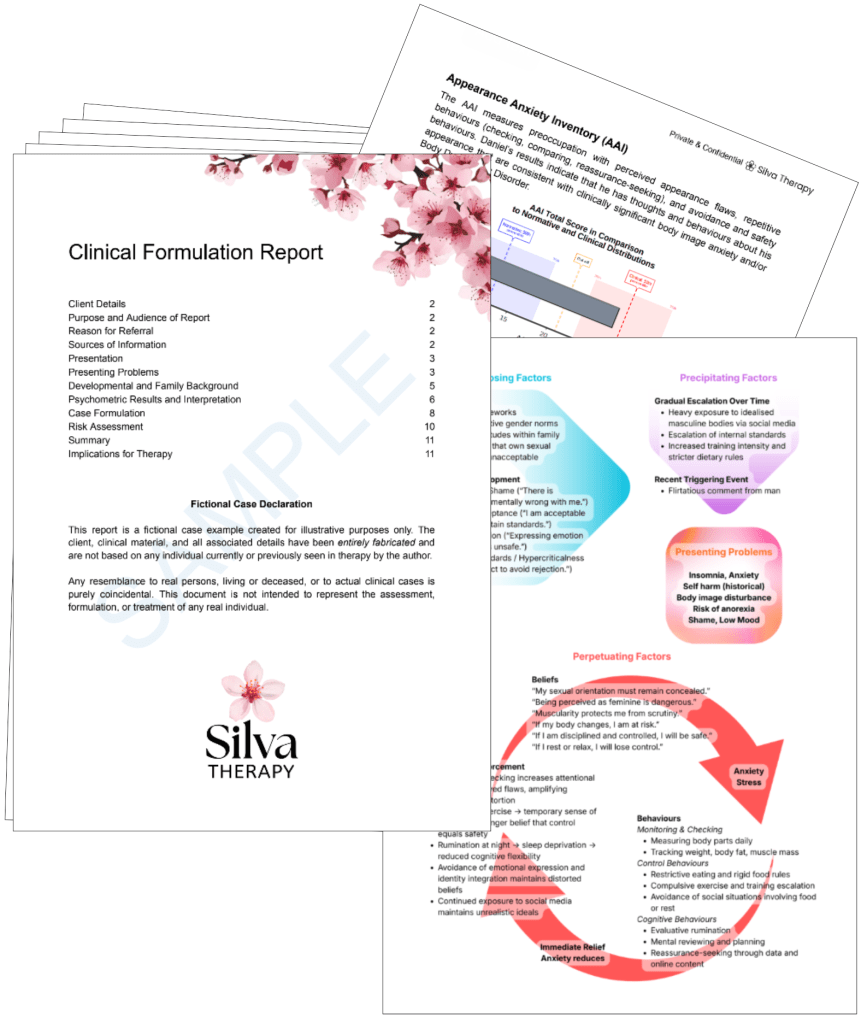 I synthesise this information into a psychological formulation, which I will explain and discuss with you in session. This formulation outlines the factors that have contributed to your current difficulties, the patterns that may be maintaining them, and the strengths and capacities that can support change. Your assessment results and formulation can be provided as a written report for you to take home and keep.